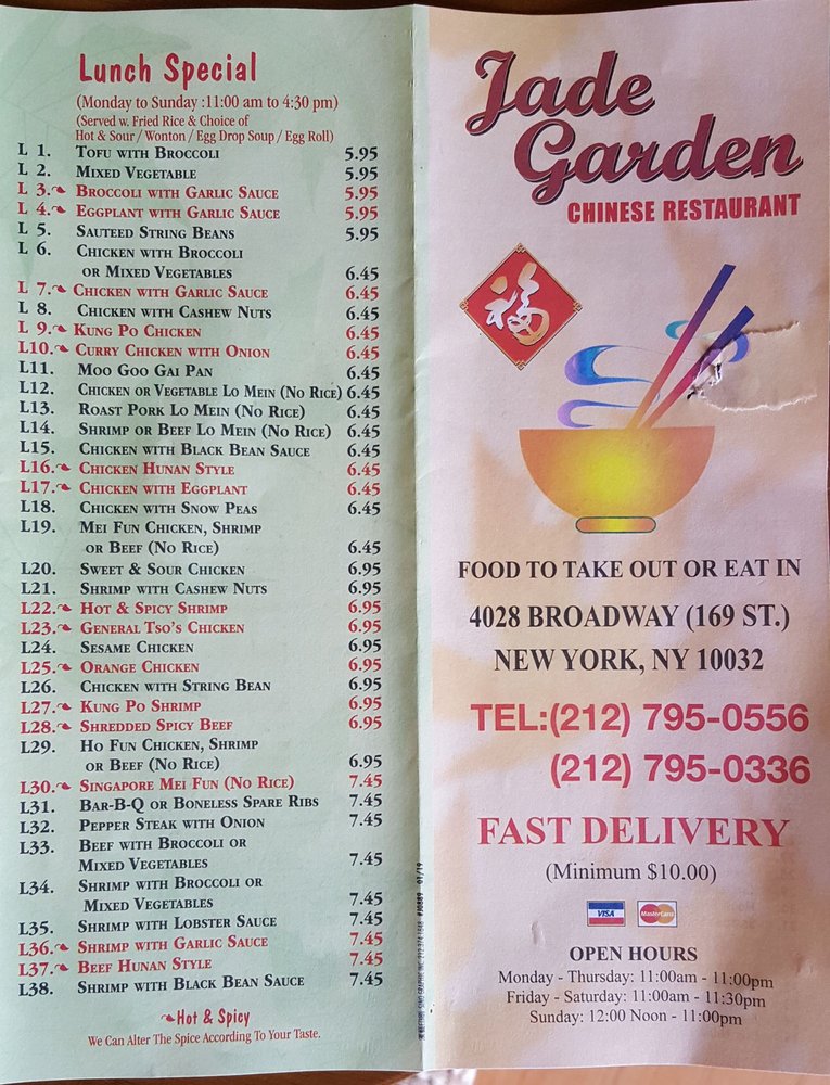 Welcome to Jade Garden, a Chinese seafood restaurant located in New York City. Offering a variety of appetizers like Egg Rolls and Wontons, and a selection of soups including Wonton and Hot & Sour, Jade Garden delivers delicious meals straight to your doorstep. The customer reviews rave about the fast service and tasty dishes, with favorites like Sesame Seed Chicken and Fried Rice standing out. If you're in the mood for American Chinese fare at reasonable prices, Jade Garden is the place to be. Enjoy a casual dining experience with options for outdoor seating and catering services, making it a great spot for groups or families. Don't miss out on trying their popular dishes and experience the flavors of Jade Garden today!